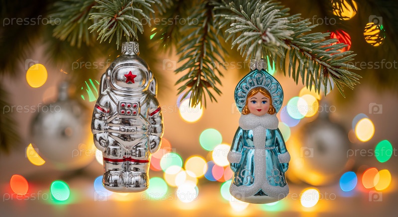 Макросъемка старинных советских рождественских украшений на еловой ветке с разноцветными огоньками-боке