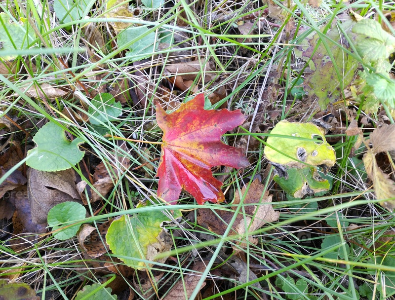 Первые осенние листья на зеленой траве в парке. осенняя природа с упавшими листами в солнечный день. красочные красные кленовые листья. красота природы. прогулки по осеннему парку или лесу