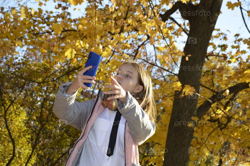 Красивая девушка фотографируется на смартфоне во время прогулки по осеннему парку. селфи для социальных сетей и в качестве сувенира. связь через Интернет. общение и коммуникация