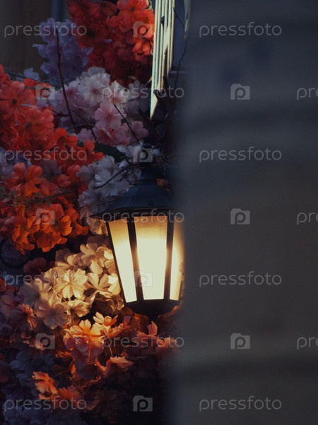 Уличный фонарь среди цветов на фасаде исторического здания в городе Санкт-Петербург