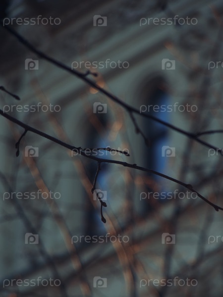 Ветви деревьев в макро на фоне доходного дома в городе Санкт-Петербург
