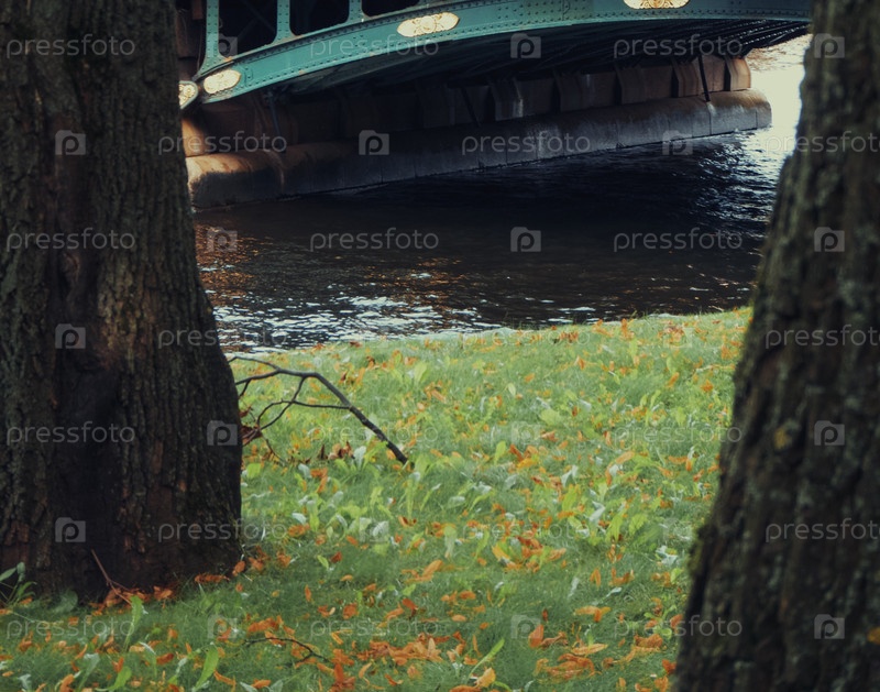 Упавшая ветвь на фоне канального моста, между могучих стволов вековых деревьев рядом с Михайловским Садом города Санкт-Петербург
