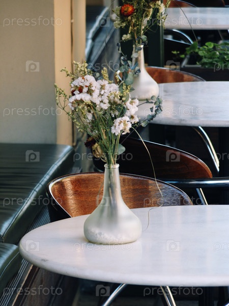 Ваза на столике с летними, свежими цветами на мансарде открытого типа у летнего кафе в городе Санкт-Петербург