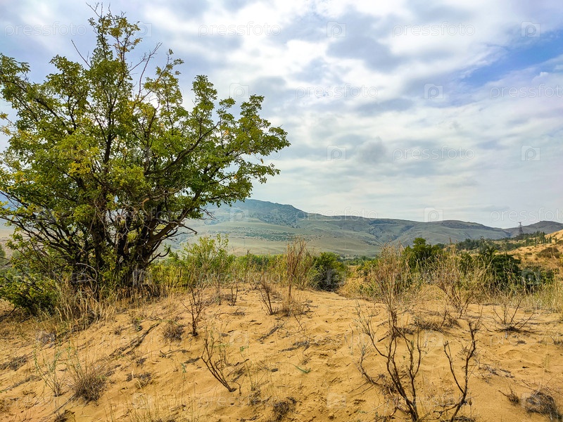 Песчаный склон с деревом и горами