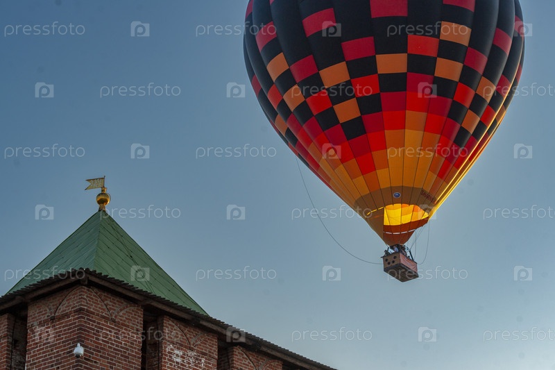 Воздушный шар над старинной башней в сумерках