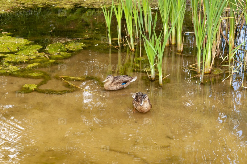 Две утки плавают в летнем пруду