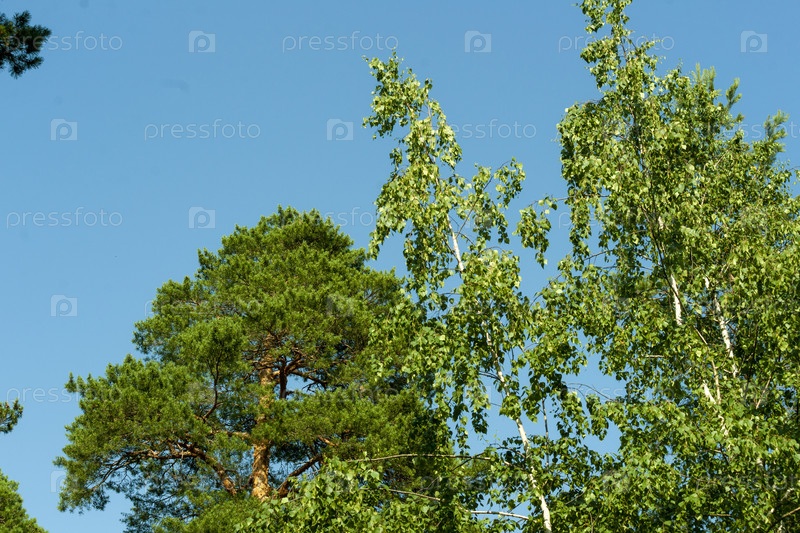 Вершины березы и сосны на голубом небе