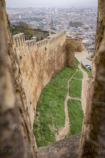 Дербентская крепость в старом городе Дербент. Часть крепостной стены и центральный вход. . Россия, Дагестан