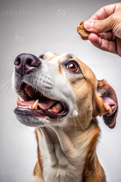 Близкий портрет собаки, взволнованной угощением во время яркой комнатной обстановки