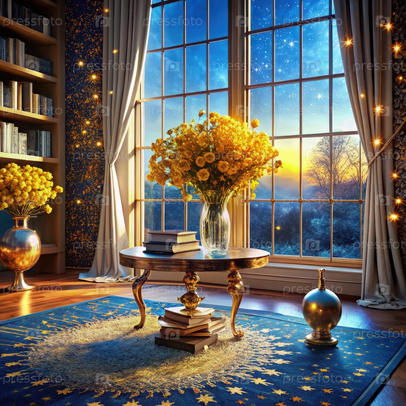 Уютная комната с синим ковром, золотыми цветами и потрясающим видом на закат