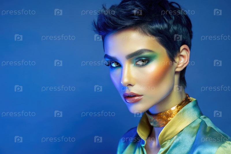 Модель с короткими черными волосами демонстрирует яркий макияж на темном градиентном фоне