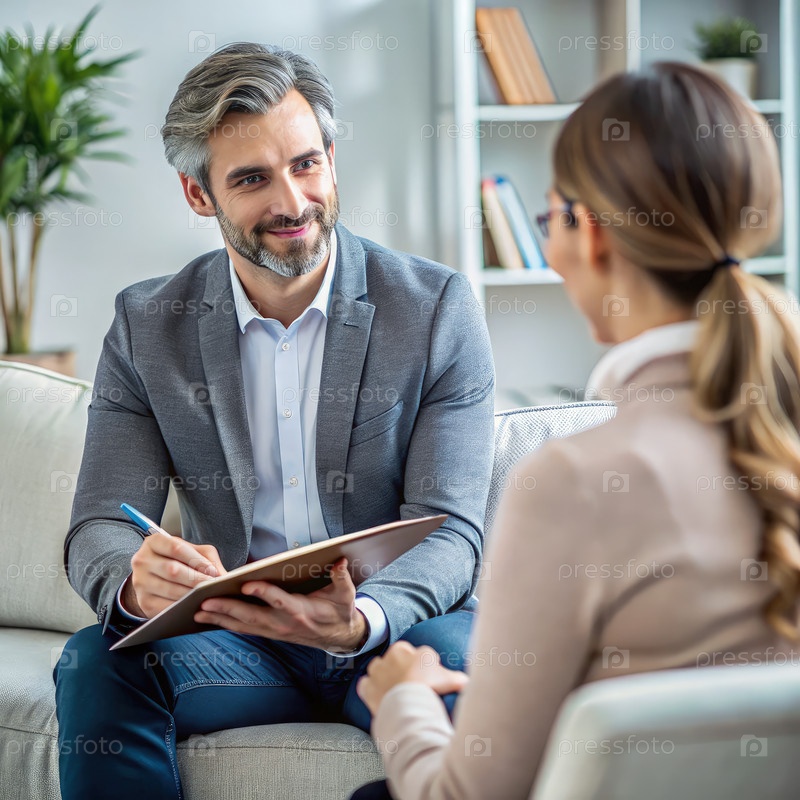 Мудрый психолог общается с клиентом в уютном офисе