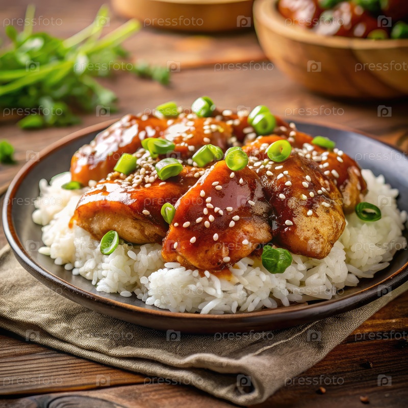 Вкусная курица терияки, подаваемая на пушистом рисе с свежими зелеными луками