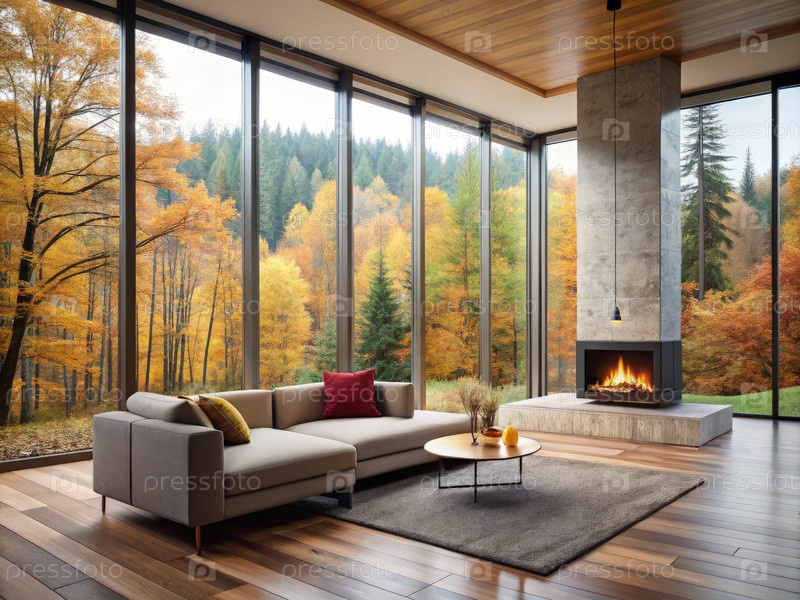 Просторная минималистическая гостиная с камином и осенним видом на лес