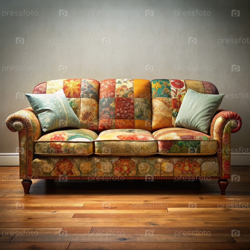 Уютный переодетый диван с ярким дизайном пластырей в хорошо освещенной комнате. генеративная ИИ