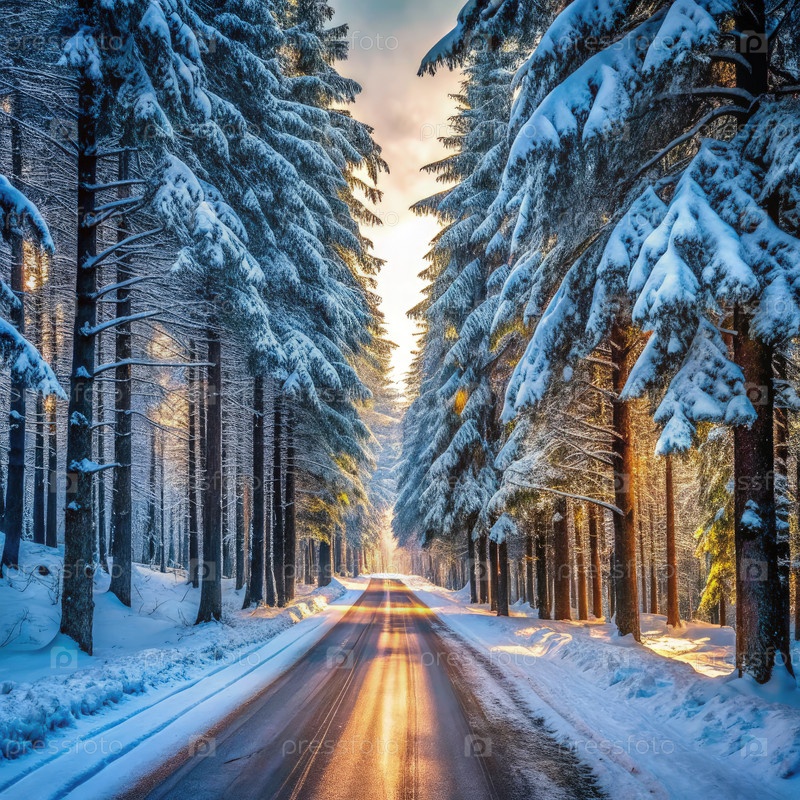 Заснеженная дорога, облицованная деревьями в спокойном зимнем лесу при закате солнца