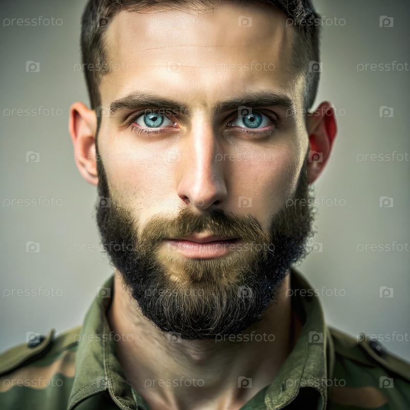 Портрет мужчины в военном стиле, с ярко-зелеными глазами и бородой