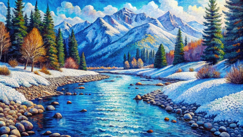 Спокойный ручей течет через заснеженные горы в живописном пейзаже