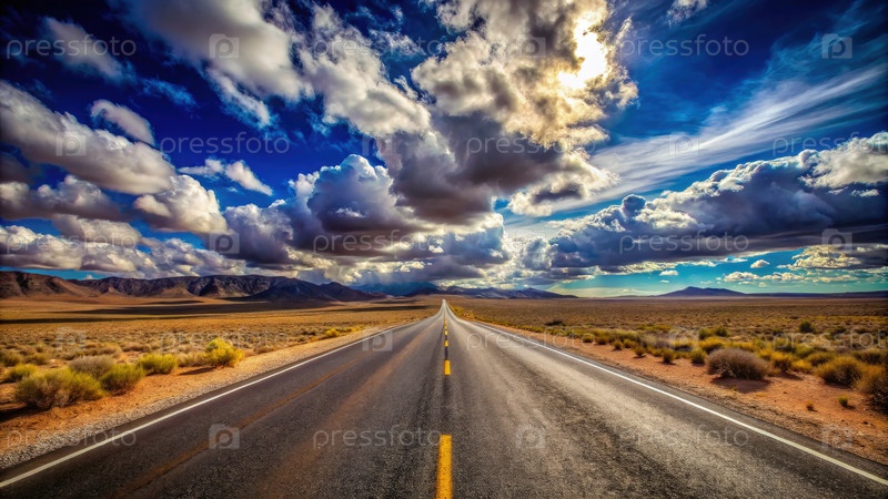 Широкоугольный вид открытой дороги в пустынном ландшафте под драматическими облаками
