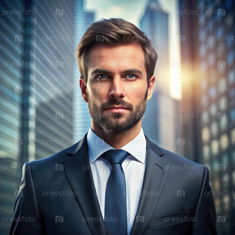 Уверенный бизнесмен, стоящий перед современными небоскребами в городской обстановке
