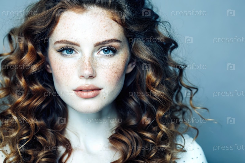 Красивая рыжеволосая женщина с локонами позирует на мягком фоне