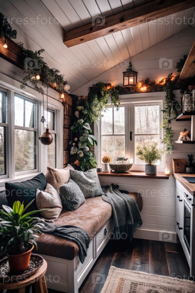 Уютный крошечный дом, гостиная с растениями и теплым освещением на небольшом пространстве. генеративный ИИ