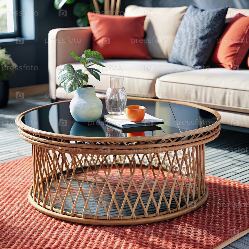Стильный кофейный стол из ротана в современной гостиной с яркими элементами декора