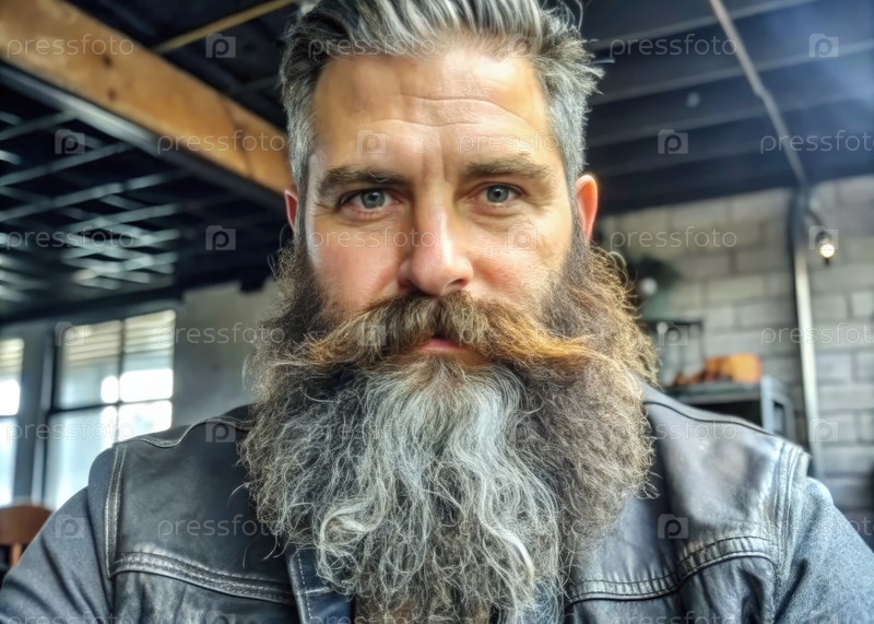 Бородатый мужчина позирует в помещении со стильной кожаной курткой и уверенным выражением лица