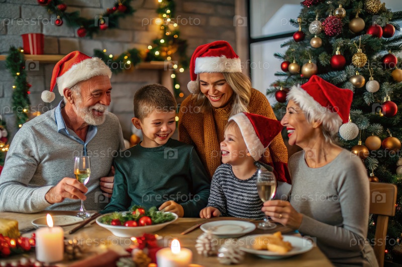 Семья наслаждается праздничным рождественским ужином вместе, радостно празднуя