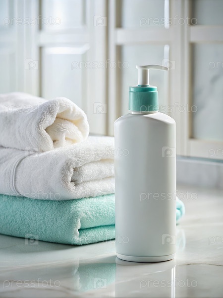 Близкий взгляд на белую пластиковую бутылку рядом со сложенными полотенцами в спа-устройстве