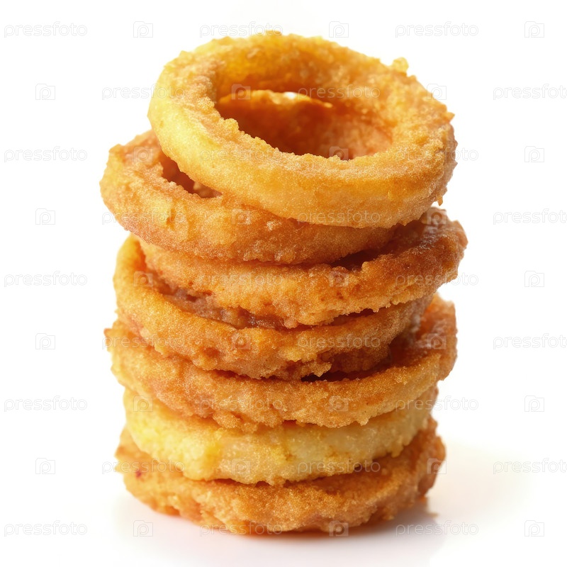 Куча хрустящих жаренных луковичных колец на белом фоне, готовых насладиться