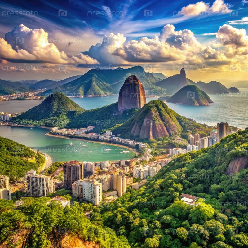 Потрясающий вид на береговую линию Бразилии с горой Сахарный хлеб при закате