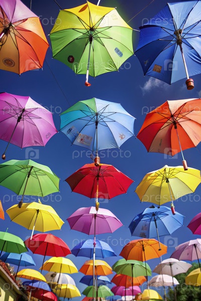 Красочные зонтики подвешены на ярком дисплее под чистым голубым небом