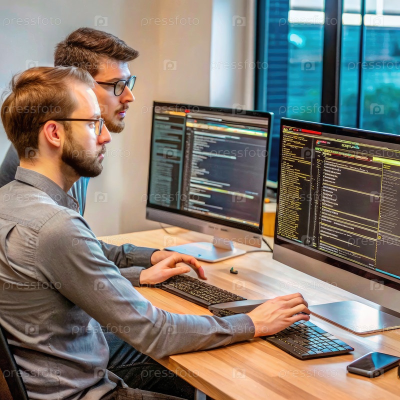 Два frontend-разработчика работают вместе в современном офисе днем