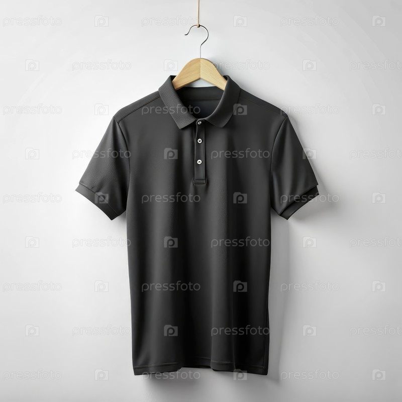Черная футболка с поло на вешалке, отображаемая на простом фоне