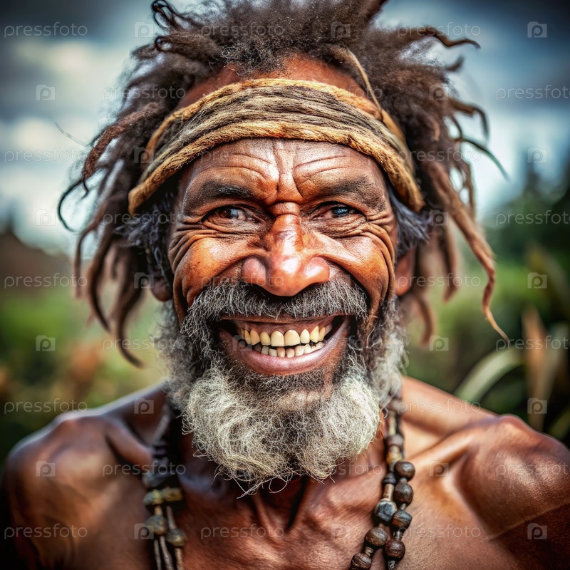 Примитивный человек радостно улыбается в естественном ландшафте в солнечный день
