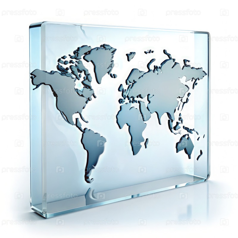 Вертикальный стеклянный символ карты мира на белом фоне, демонстрирующий глобальную географию