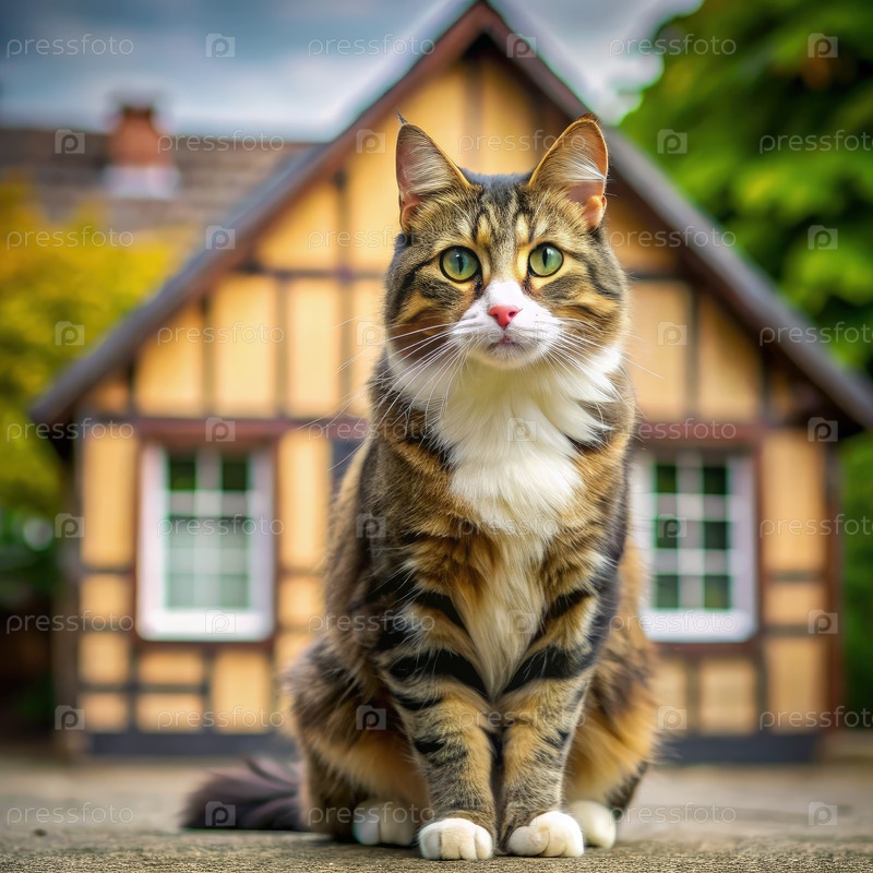 Красивый котенок, сидящий перед очаровательным деревянным домом в дневное время