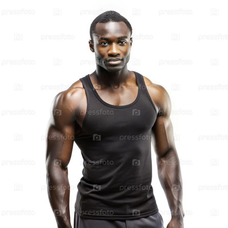 Черный мужской модель уверенно позирует в танковом топе на простом фоне