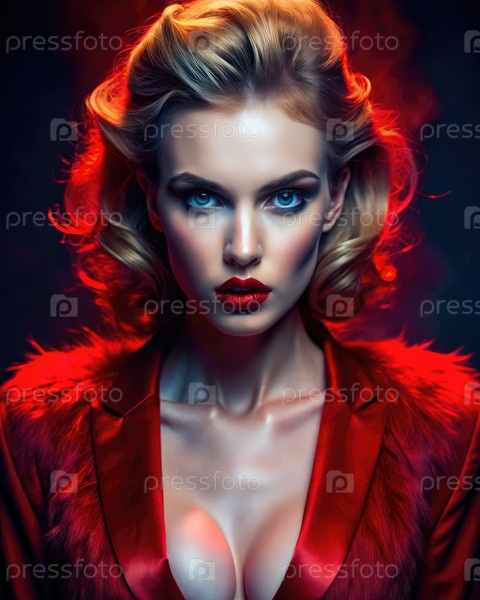 Модель излучает уверенность с яркими чертами лица и смелыми красными губами, одетая в роскошный красный наряд