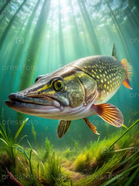 Близкий взгляд на хищную щуку, плавающую среди подводных растений в озере