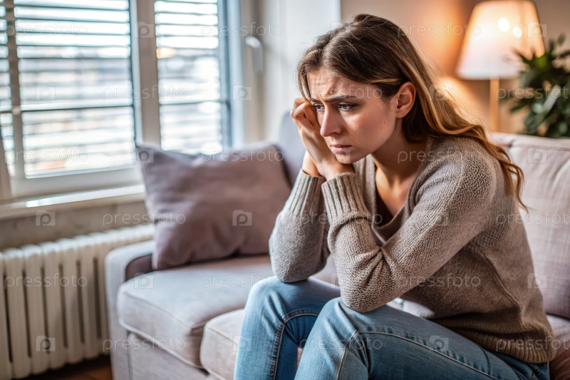 Печальная женщина сидит на диване, размышляя о своей борьбе с депрессией в помещении