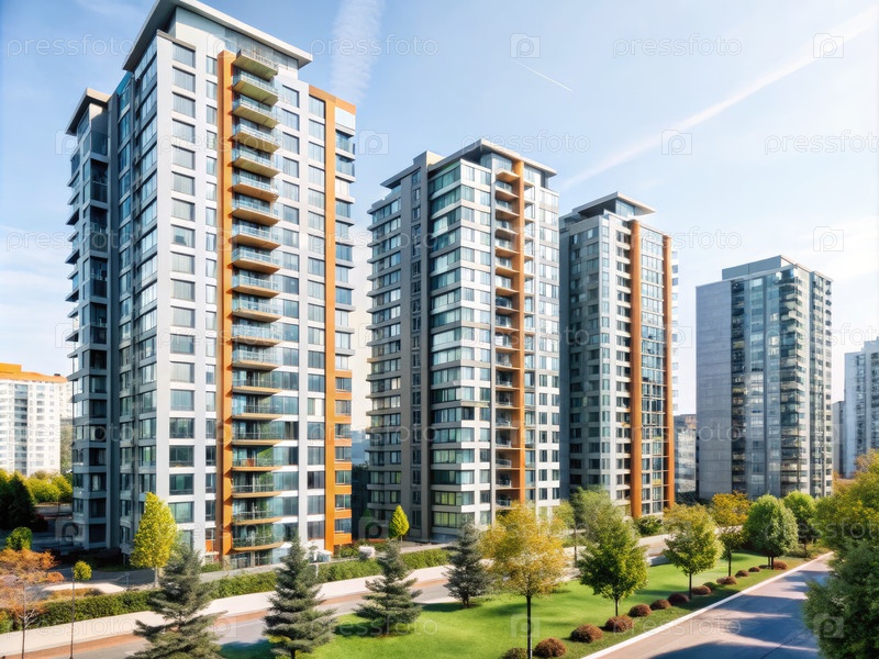 Современные многоэтажные жилые дома с благоустроенными территориями в дневное время. генеративный ИИ