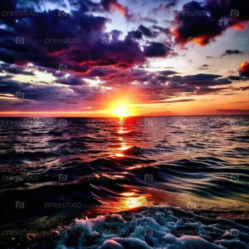 Потрясающий закат над морем с яркими облаками, отражающими золотые оттенки