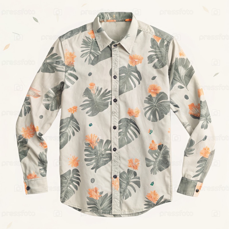 Стильная рубашка с пуговицами и тропическим узором, в которой есть зелень и цветочные акценты