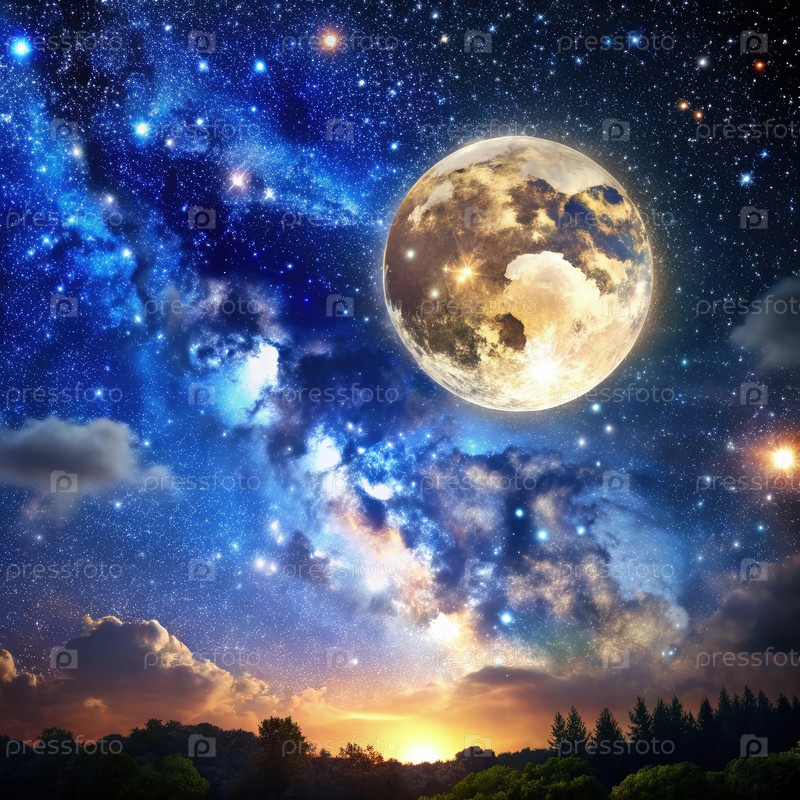 Потрясающий вид на звездное ночное небо, освещенное яркой луной
