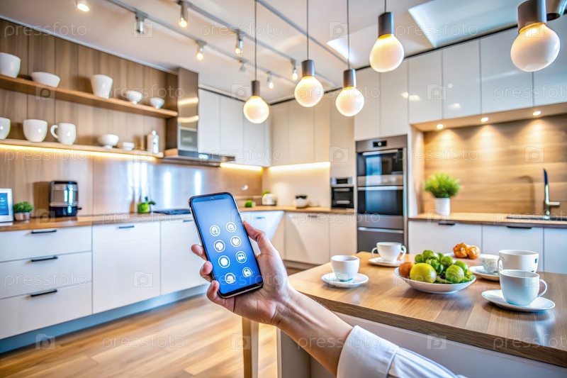 Управление кухонным весами с помощью телефона в современной кухне. генеративный ИИ