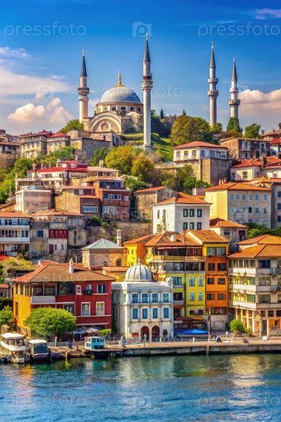 Вибрирующие дома вдоль набережной Стамбула с фоном мечети в солнечный день