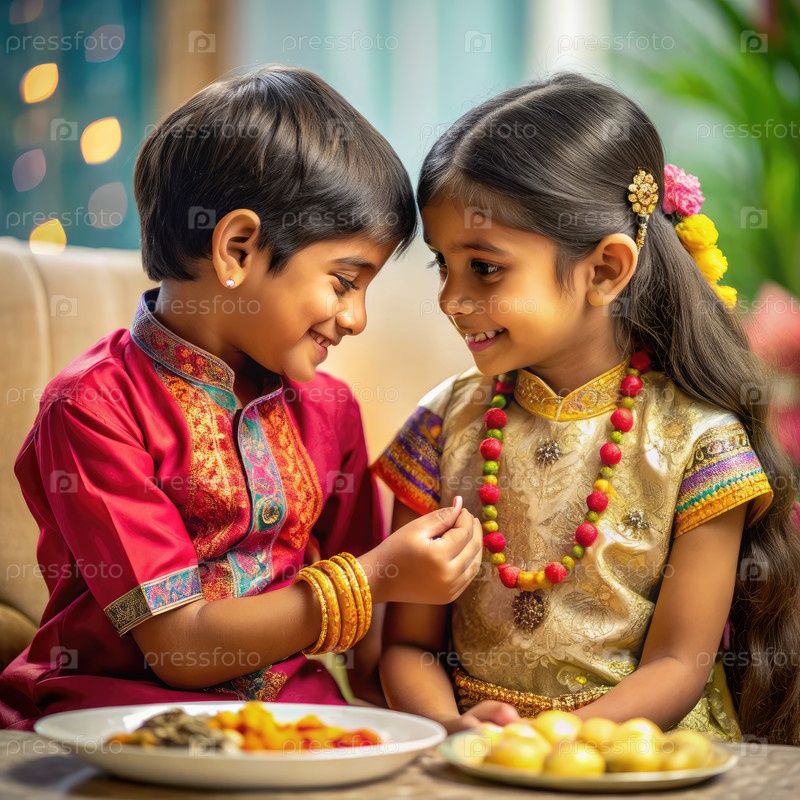 Два брата и сестра делятся нежным моментом во время Ракша-Бандана, одетые в традиционные наряды