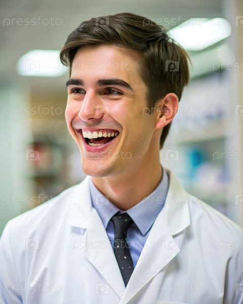 Улыбающийся студент-фармацевт в лабораторном пальто во время практической тренировки